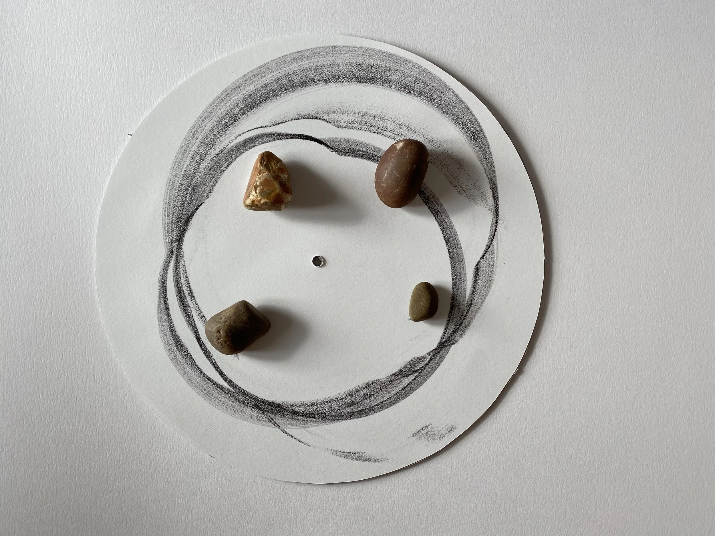 Installation View, Turntable Drawing: Untitled #5, Ink and pebbles on paper, 31cm x 31cm